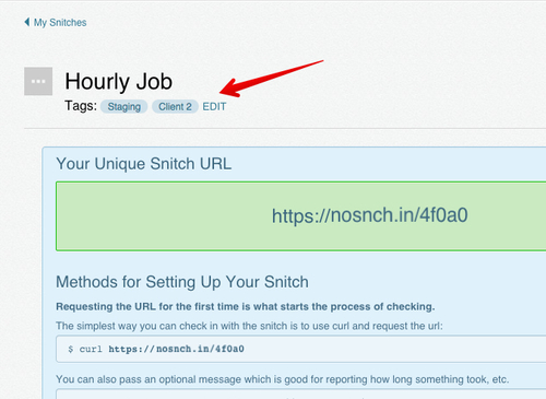 Tags are displayed on each snitch install page for easy editing.